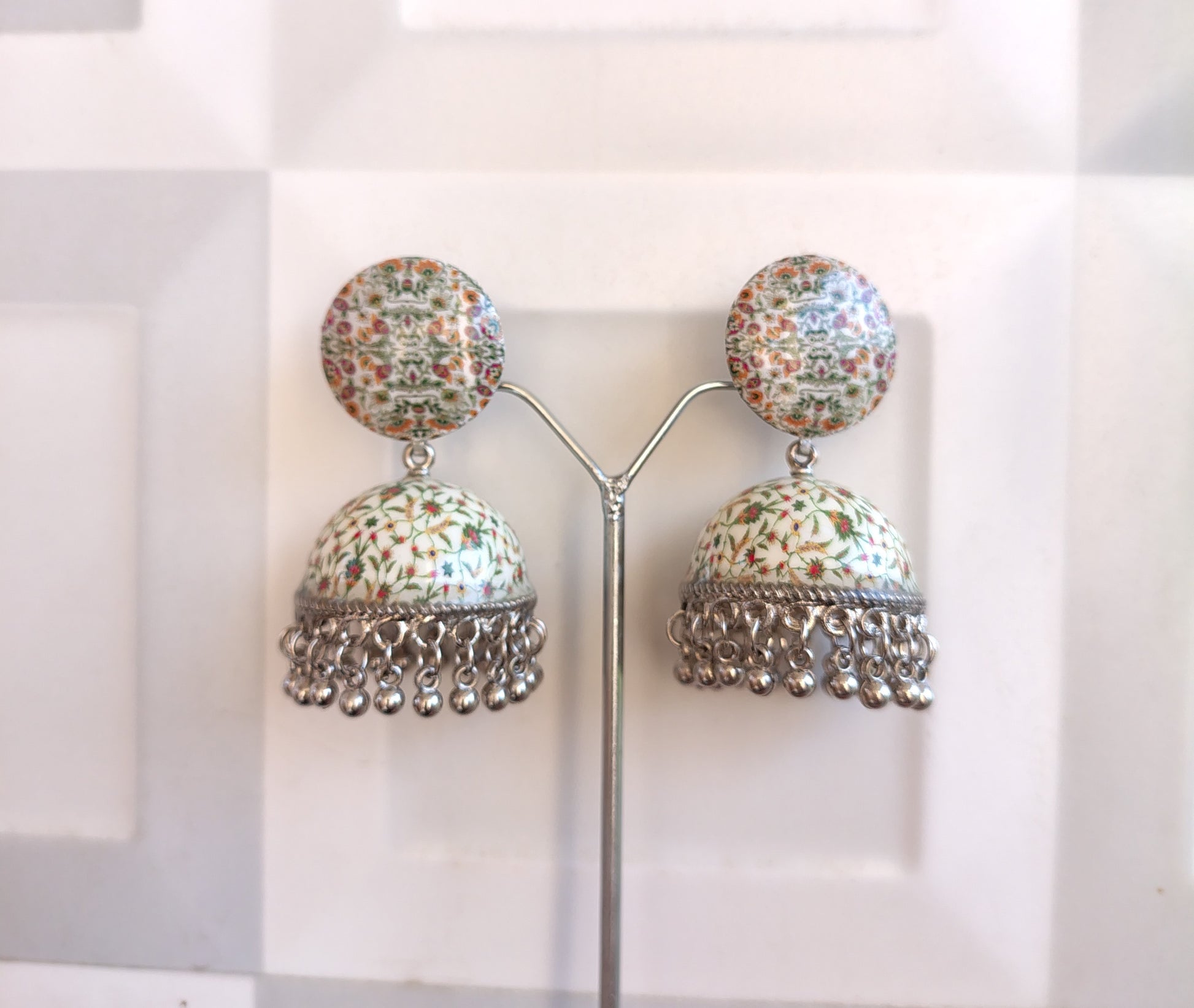 The dome-shaped jhumka base is also adorned with fine floral motifs on a white background, showcasing traditional hand-painted craftsmanship.