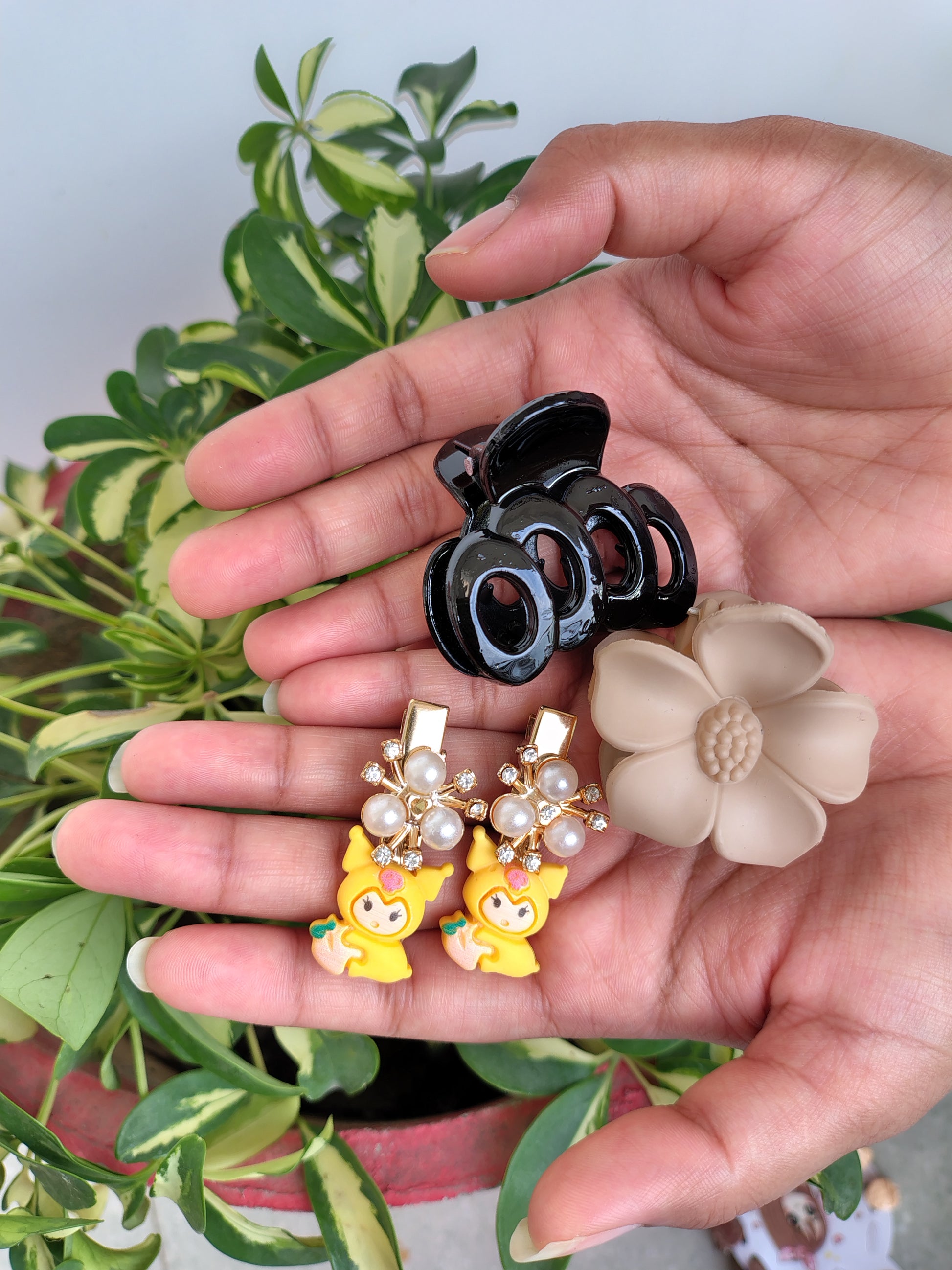Cute Yellow Cartoon Earrings (paired accessory) – Although not a hair accessory, the earrings feature adorable cartoon figures in yellow outfits, accented with pearl and stone floral tops. They add a playful and charming touch to any look.