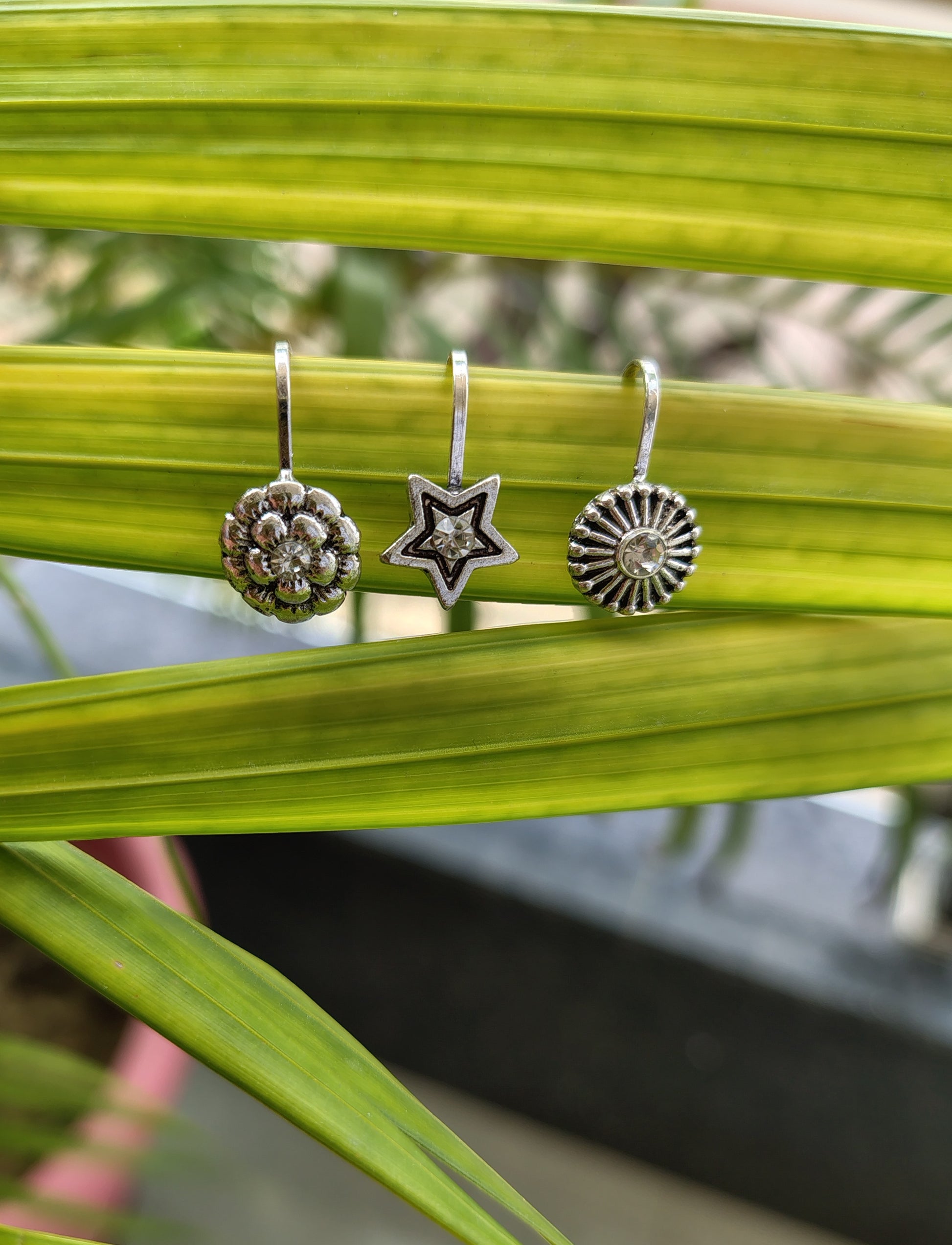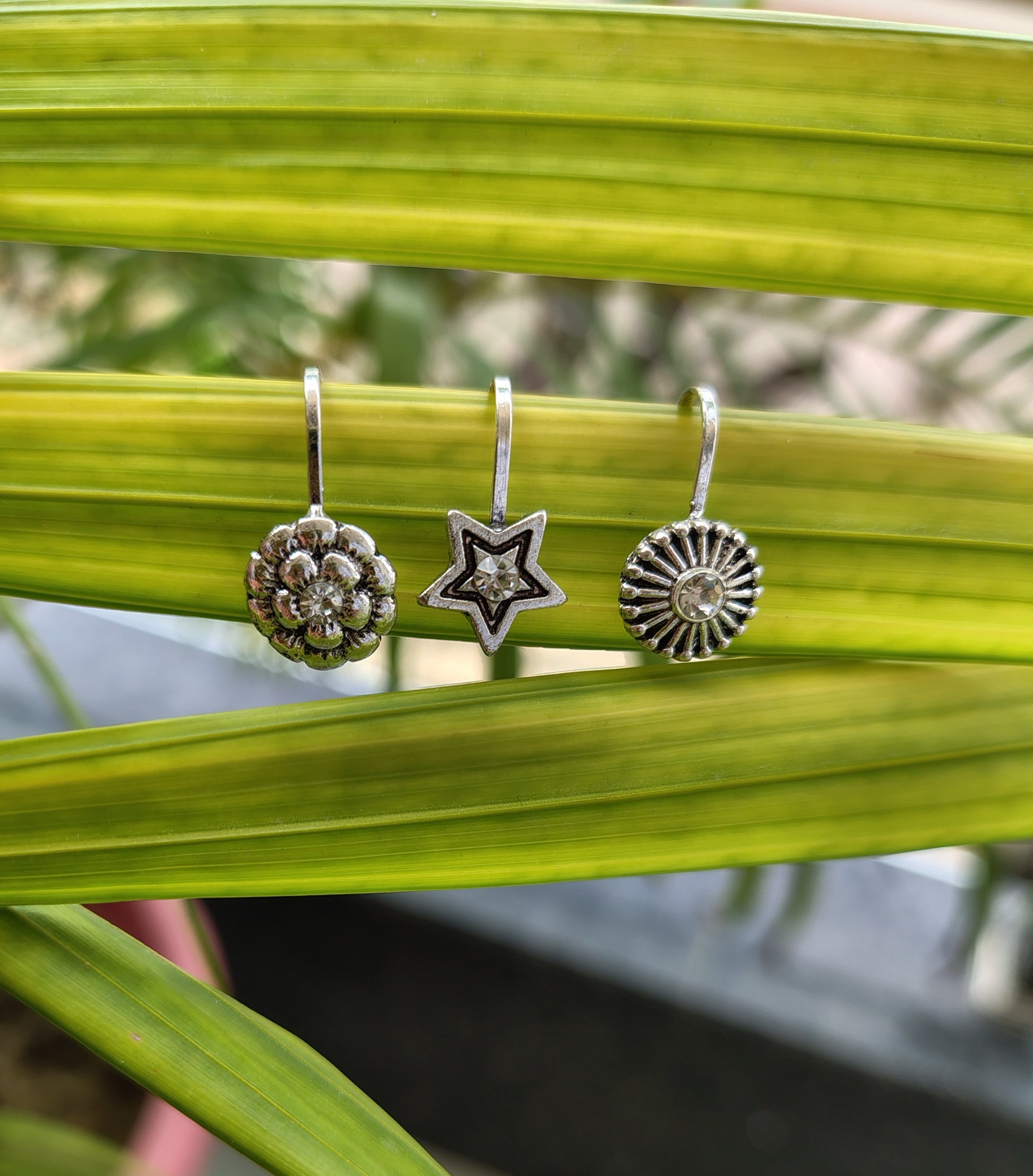 A stylish set of oxidized silver nose studs, each designed with unique detailing to suit different moods and looks: