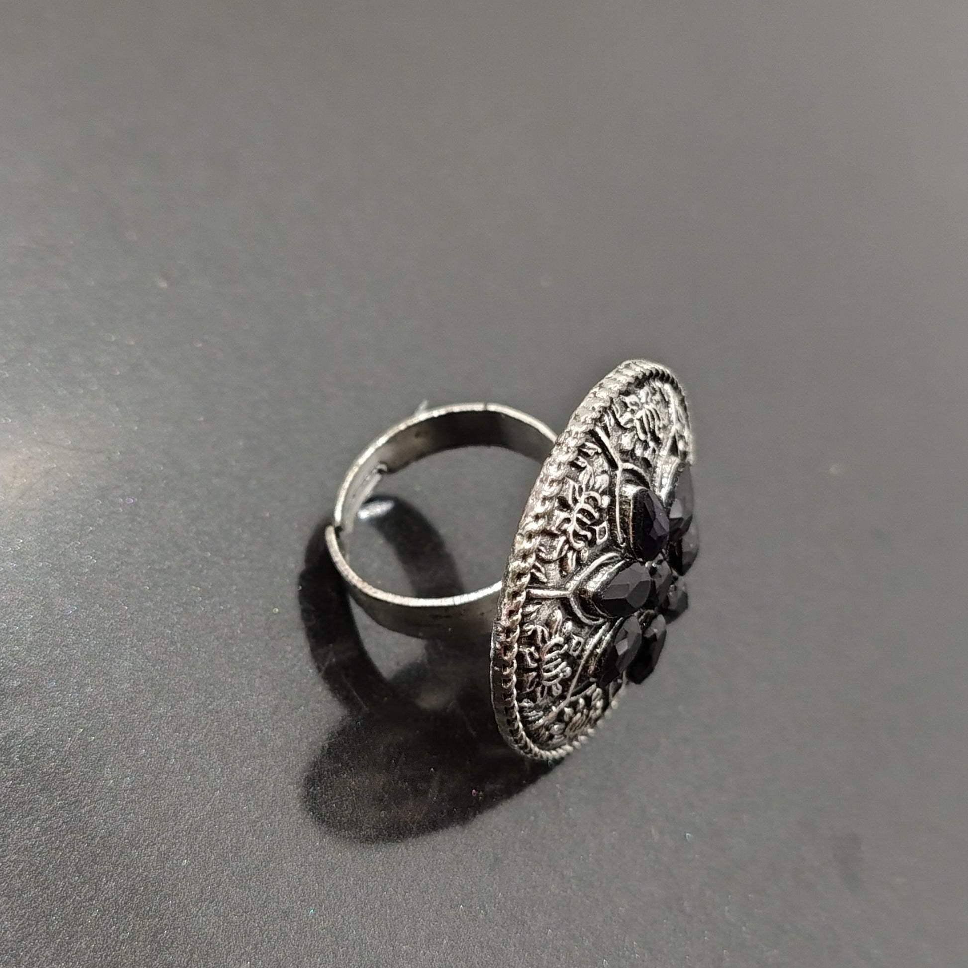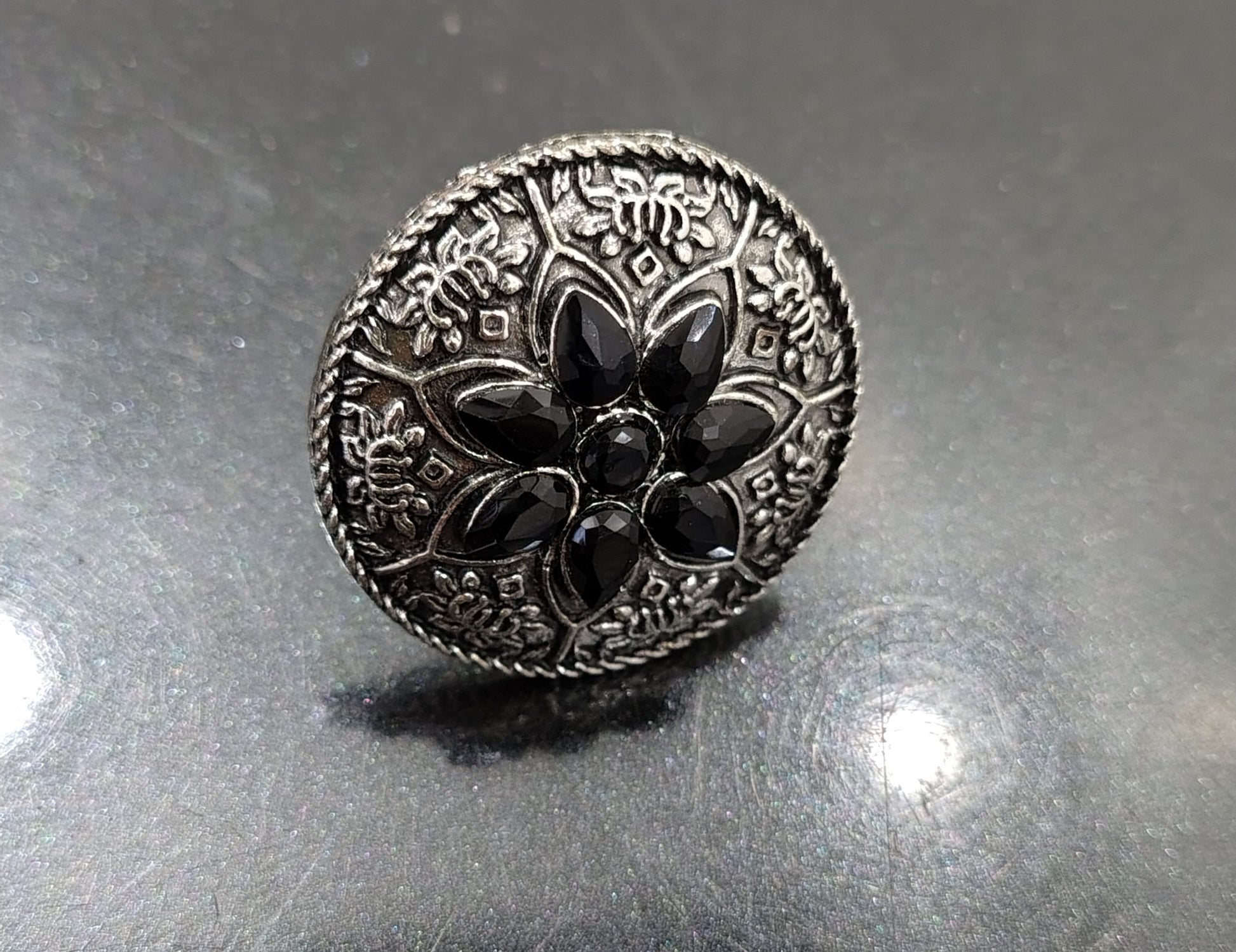 This is a striking oxidized silver statement ring with a bold, traditional design. The centerpiece features a large circular face adorned with a floral motif, where six black faceted stones are arranged like petals around a central stone, creating a captivating flower pattern. The surrounding area is intricately engraved with ethnic, handcrafted patterns, giving the ring a rich, antique look.