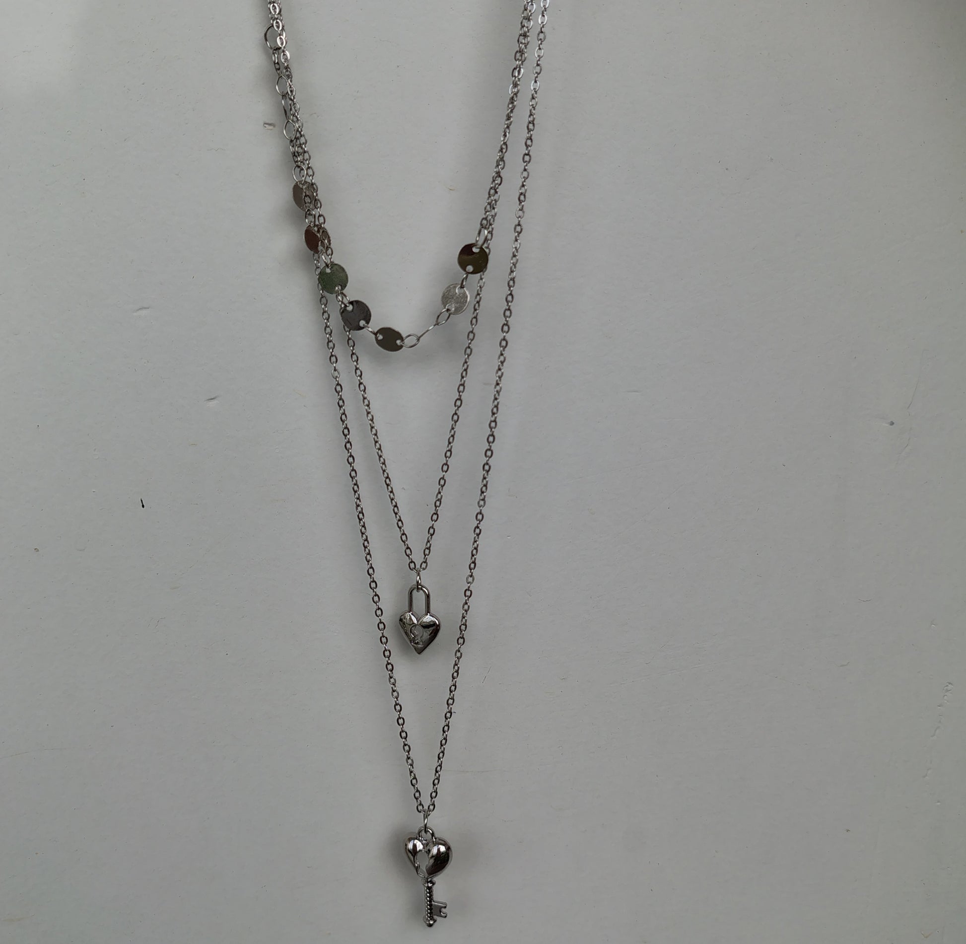 The middle chain holds a silver heart-shaped lock pendant, symbolizing love and protection.