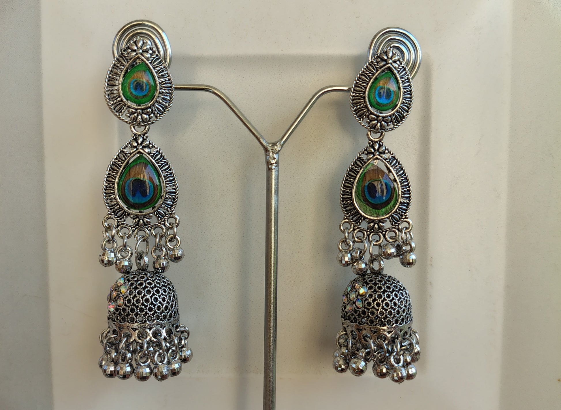 These are oxidized silver peacock feather design Jhumka earrings, blending elegance with traditional artistry.