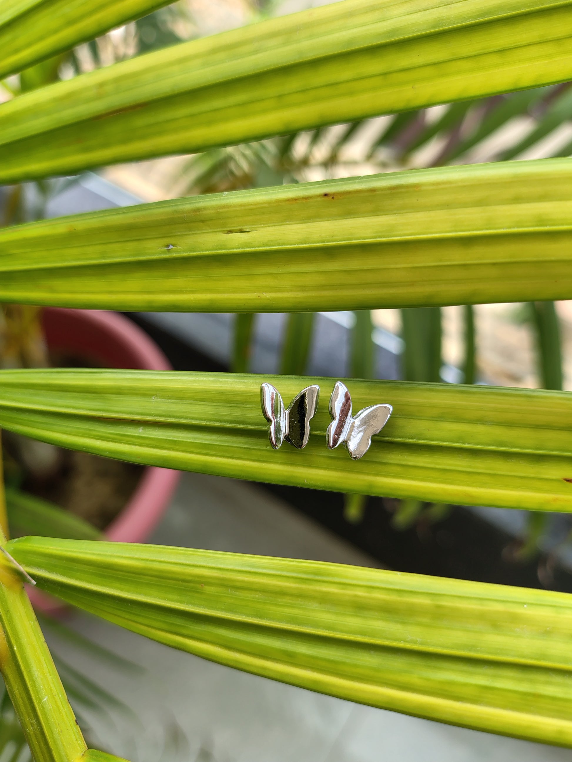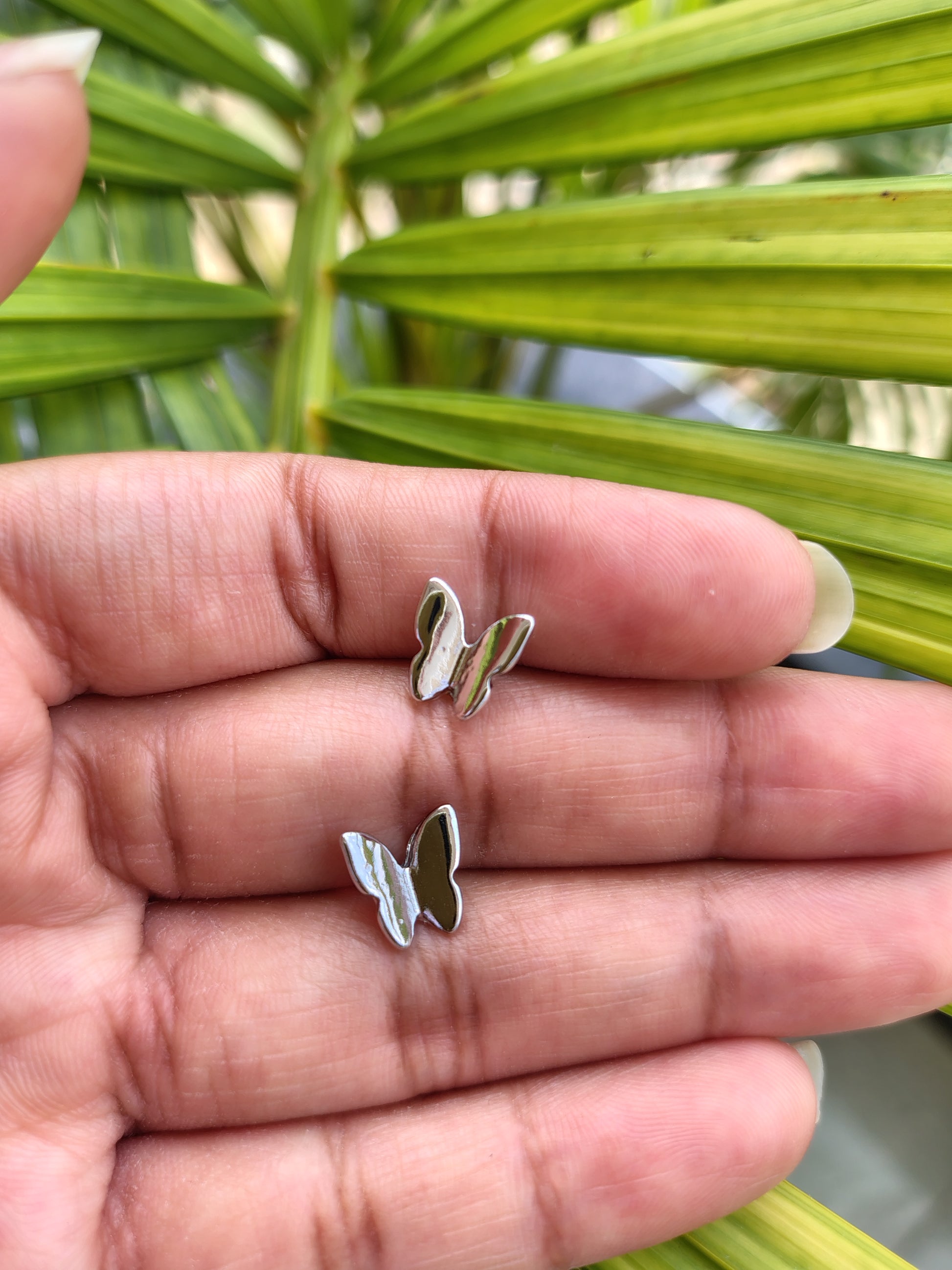 These earrings are delicate and minimalistic butterfly-shaped studs. Crafted in a shiny silver-tone metal, they feature a sleek and polished finish that reflects light beautifully, giving them a modern yet elegant look. The simple outline design of the butterfly makes them lightweight, versatile, and perfect for everyday wear, while still adding a touch of charm and playfulness. These studs can be paired with both casual and dressy outfits, making them a timeless accessory for butterfly lovers and those who prefer subtle jewelry styles.