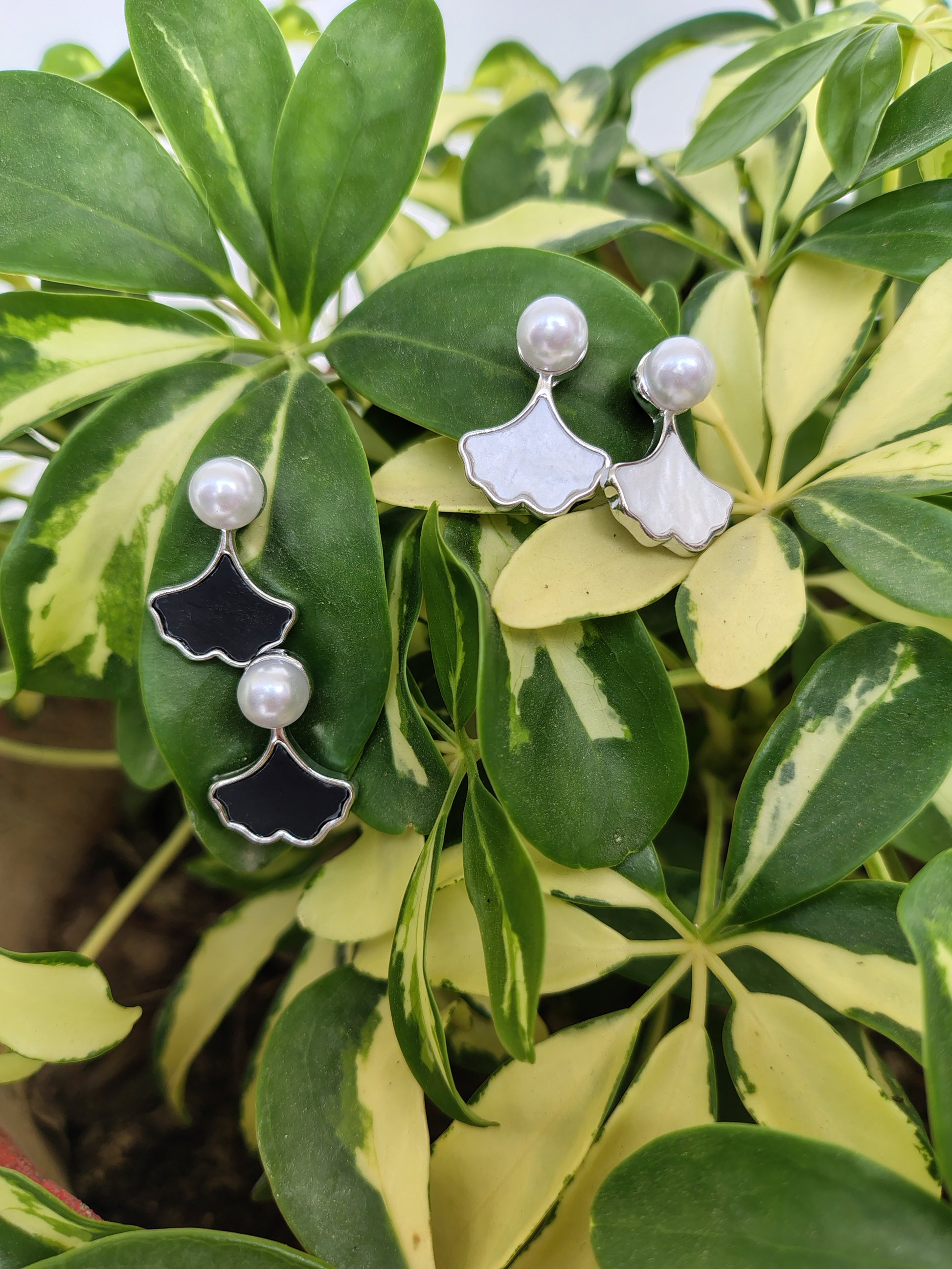 These earrings are an elegant blend of pearls and floral-inspired design. Each earring features a glossy pearl stud at the top, paired with a petal-like drop element that adds a graceful touch. The design comes in two color variations – a chic black and a soft white – both outlined with a silver finish, giving them a refined and polished look.